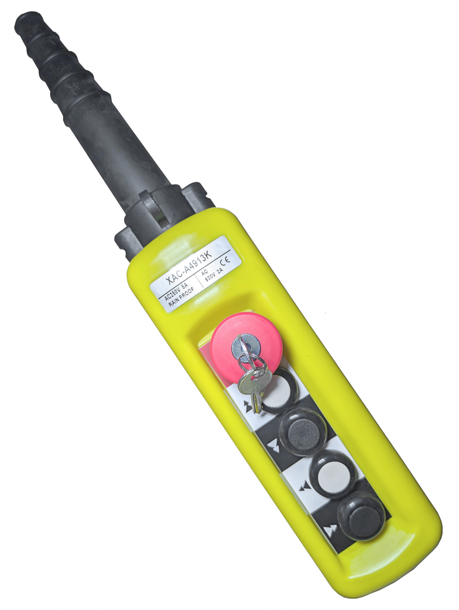 Пульт управления краном ХАС-А4913К, 4 кнопок, 2 скор., авар. стоп, ключ (пост управления кнопочный для тельфера) – является управляющим устройством для грузоподъёмного оборудования, который передаёт электрический сигнал по кабелю, на катушку магнитного пускателя, тем самым коммутирует контакты пускателя, для передачи фазы на двигатель перемещения, либо подъема тельфера. Для управления краном, необходим правильно подобранный пульт кабельный, выбор производится, учитывая количество скоростей на передвижение кран балки, а также с учетом количества скоростей на подъем или опускание тельфера электрического.