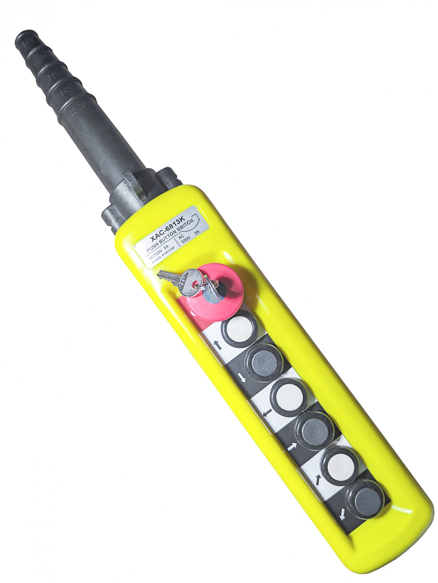 Пульт управления краном ХАС-А6813К, 6 кнопок, 1 скор., авар. стоп, ключ (пост управления кнопочный для тельфера) – является управляющим устройством для грузоподъёмного оборудования, который передаёт электрический сигнал по кабелю, на катушку магнитного пускателя, тем самым коммутирует контакты пускателя, для передачи фазы на двигатель перемещения, либо подъема тельфера. Для управления краном, необходим правильно подобранный пульт кабельный, выбор производится, учитывая количество скоростей на передвижение кран балки, а также с учетом количества скоростей на подъем или опускание тельфера электрического.