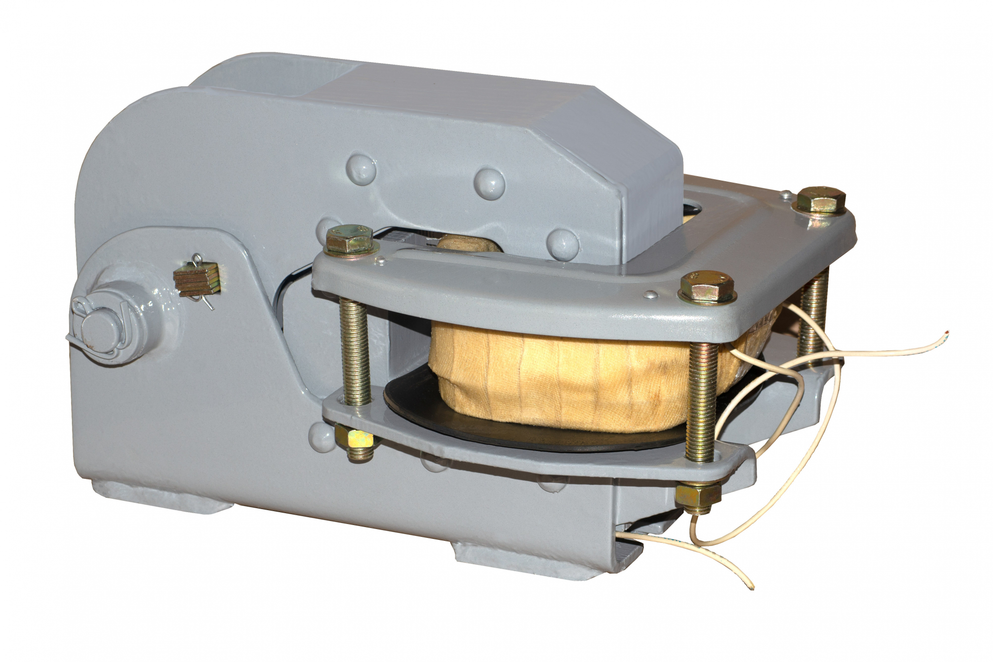 - Ярмо – жесткий стационарный стальной корпус из электротехнической стали, в который устанавливают медную катушку. Именно через ярмо электромагнит МО-300Б крепится к электромагнитному тормозу колодочного типа.